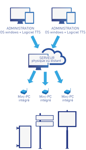 Solution de transfert et de diffusion de médias vers votre parc d’afficheurs digitaux. Notre solution permet de gérer des diffusions horodatées ou des scénarios en fonction de données externes. Cette solution répondra parfaitement à tous vos besoins en affichage mixte de jalonnement dynamique et de communication évènementielle.